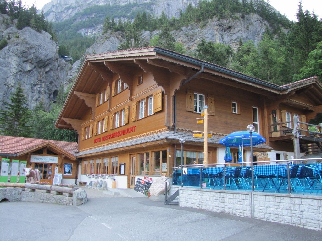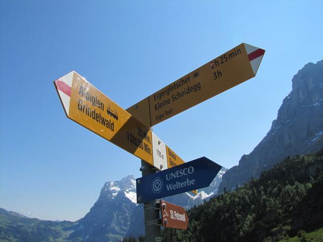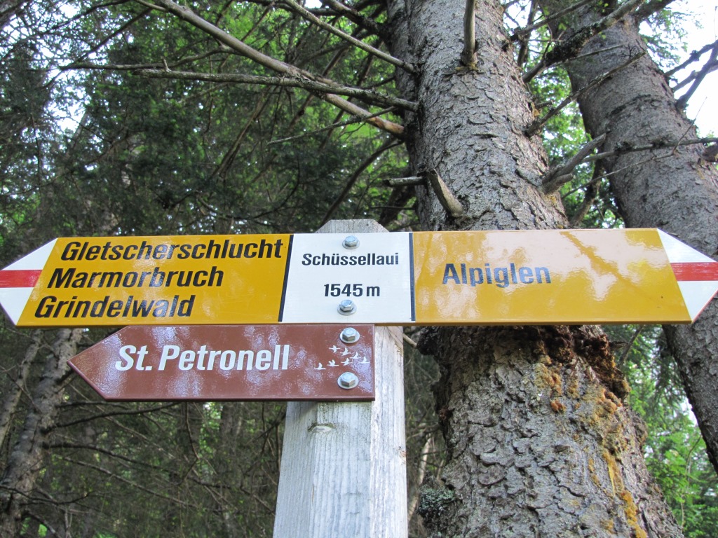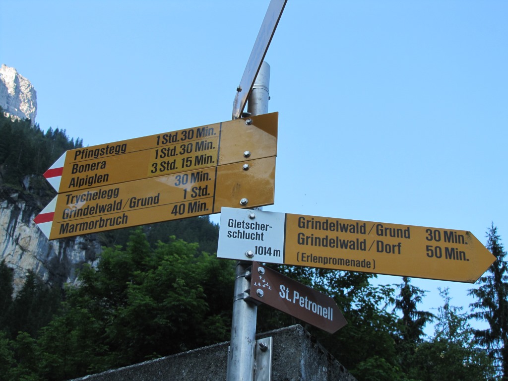 Wegweiser bei der Gletscherschlucht 1014 m.ü.M. Unser Weg führt Richtung Alpiglen
