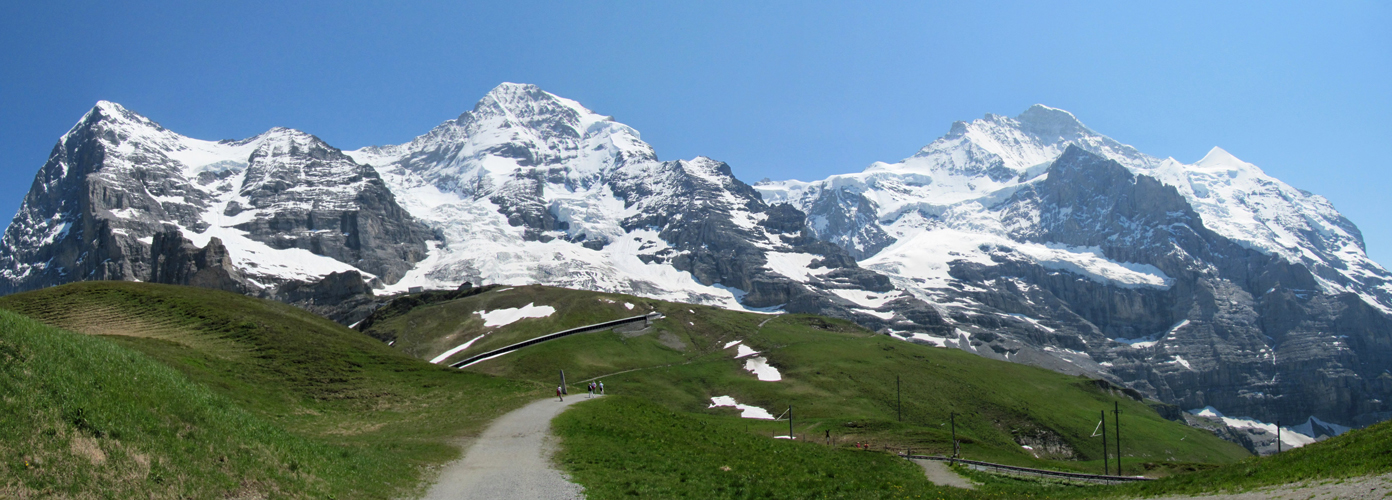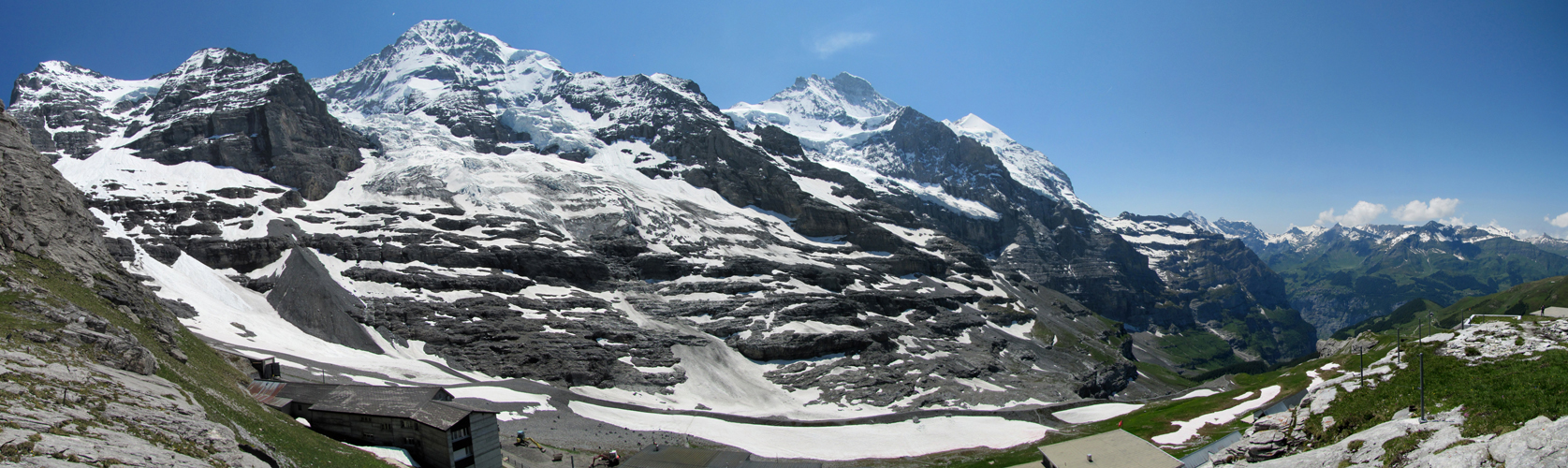 sehr schönes Breitbildfoto von der Station Eigergletscher aus gesehen, mit Blick zum Männlichen und rechts das Wetterhorn