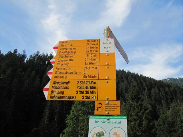 Wegweiser beim Hotel-Restaurant Simmenfälle 1105 m.ü.M.