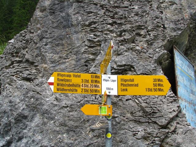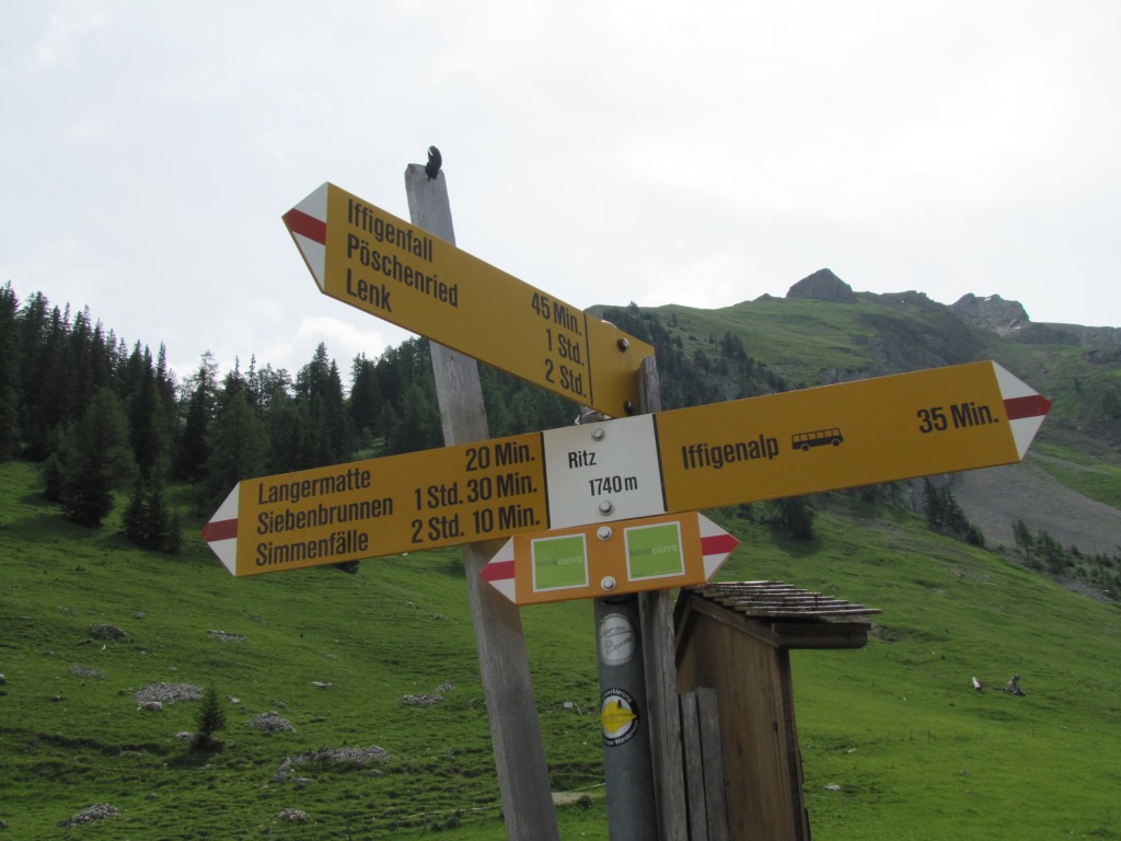 Wegweiser bei Ritz 1740 m.ü.M. nun geht es abwärts zur Iffigenalp