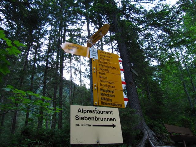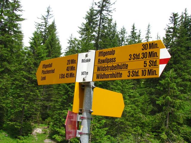 Wegweiser bei Ritz 1740 m.ü.M. nun geht es abwärts zur Iffigenalp