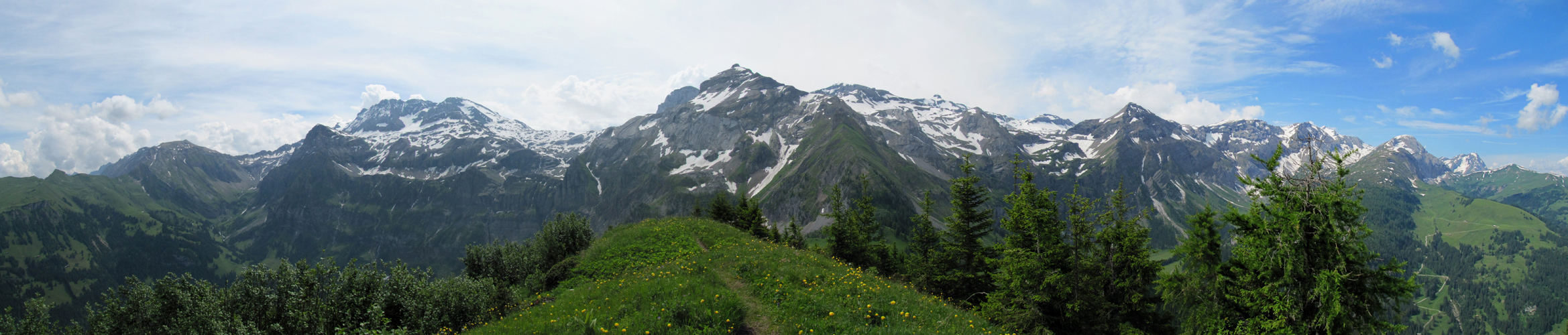 schönes Breitbildfoto von der Langermatte aus gesehen. Ammertespitz, Ammertehore, Wildstrubel und Laufbodehore