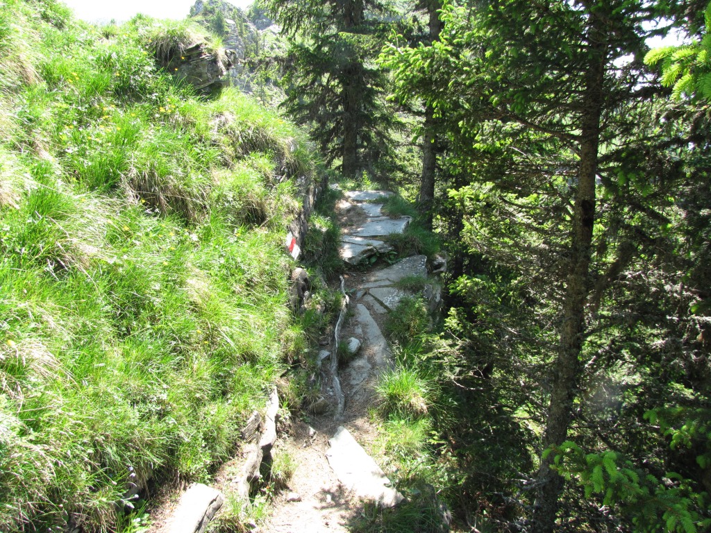 der Bergpfad schlängelt sich zwischen Tannen und Föhren