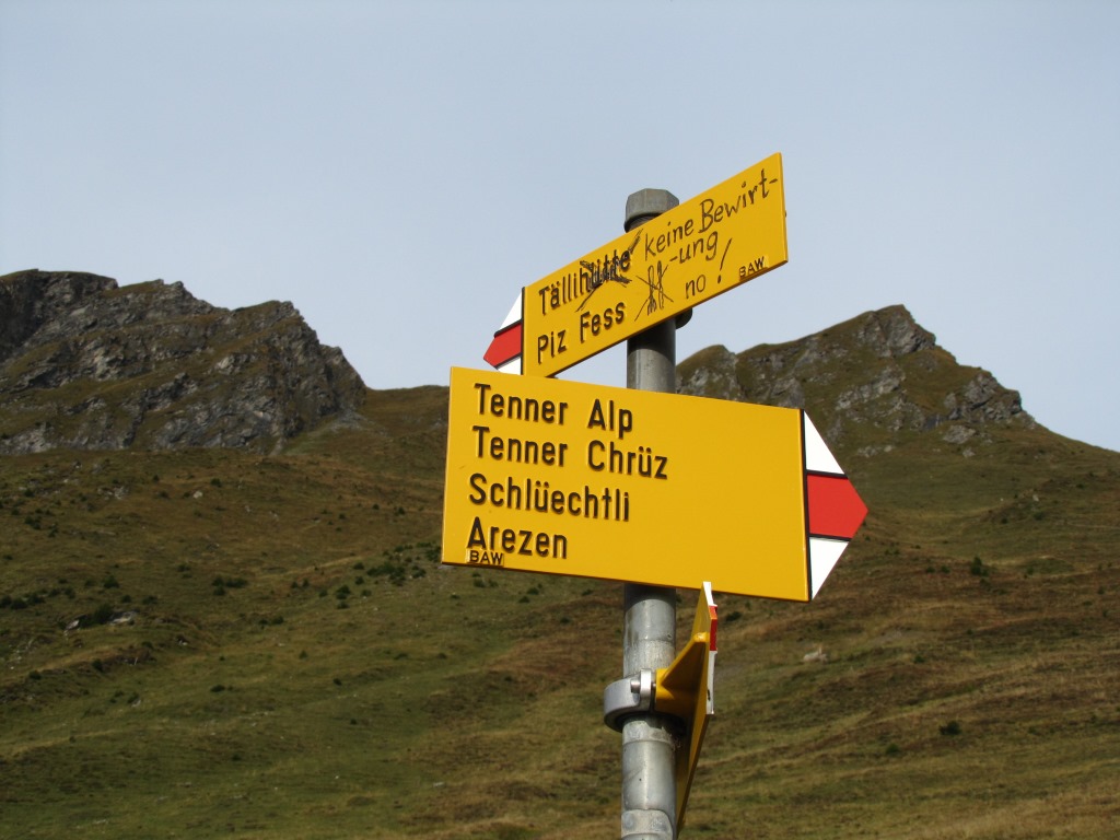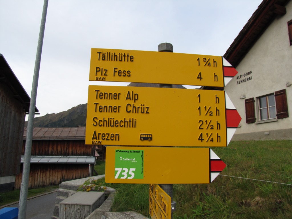 Wegweiser in Tenna 1650 m.ü.M. unsere heutige Wanderung wird uns auf den Piz Fess bringen
