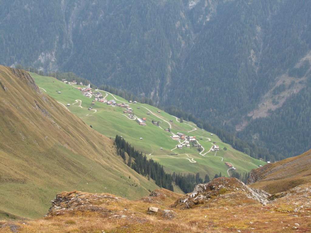 über Alpweiden geht es direkt abwärts nach Tenna. Eine schöne Bergtour geht zu Ende