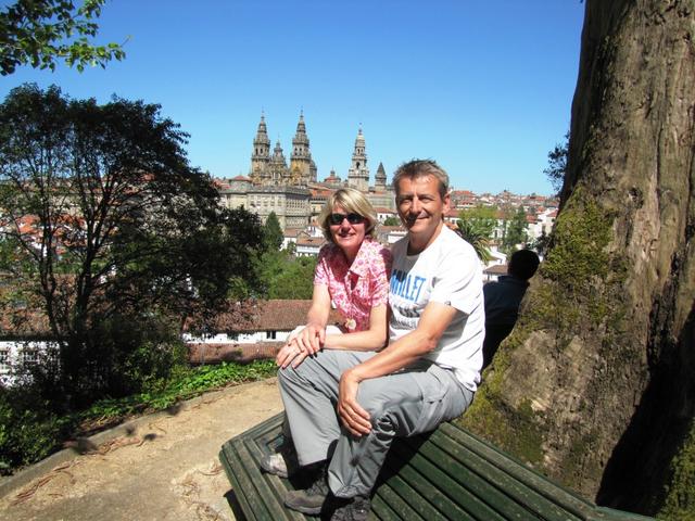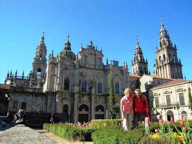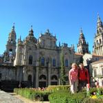 Manuela und Franco im Hintergrund die Kathedrale von Santiago