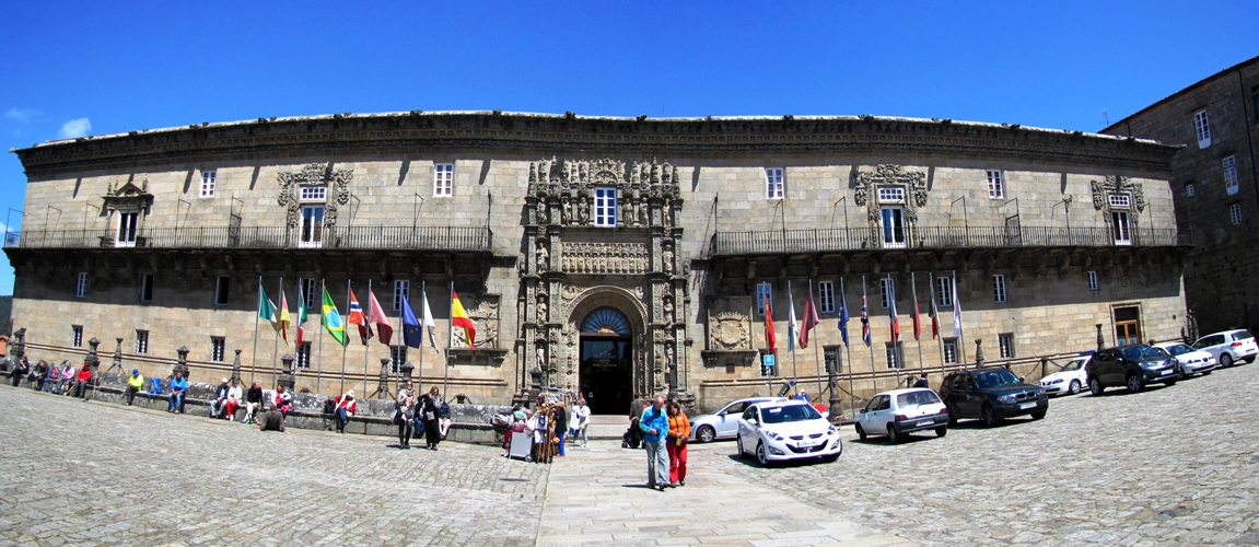 Breitbildfoto der ehemaligen Pilgerherberge Hospital de los Reyes Católicos. Heute ein Luxus Parador Hotel
