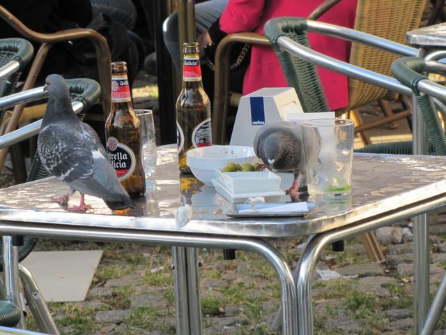 Tauben essen die Oliven die die Gäste stehengelassen haben