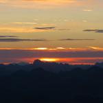 glühend rot taucht die Sonne hinter den Bergen hervor