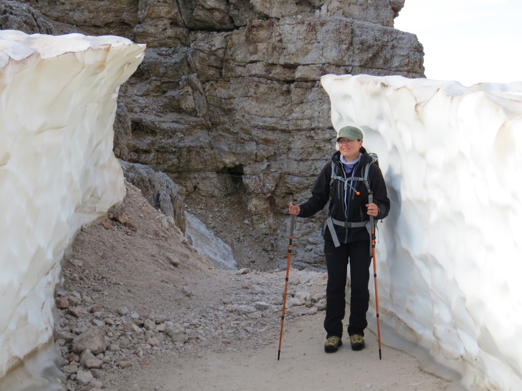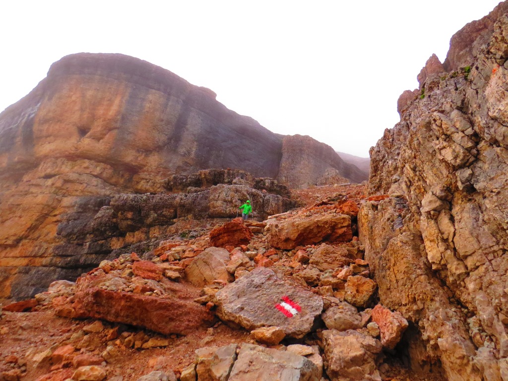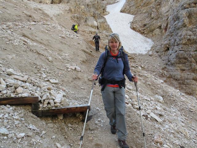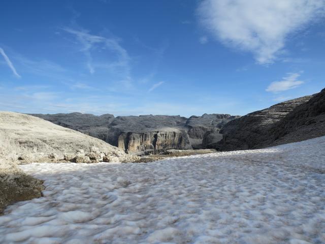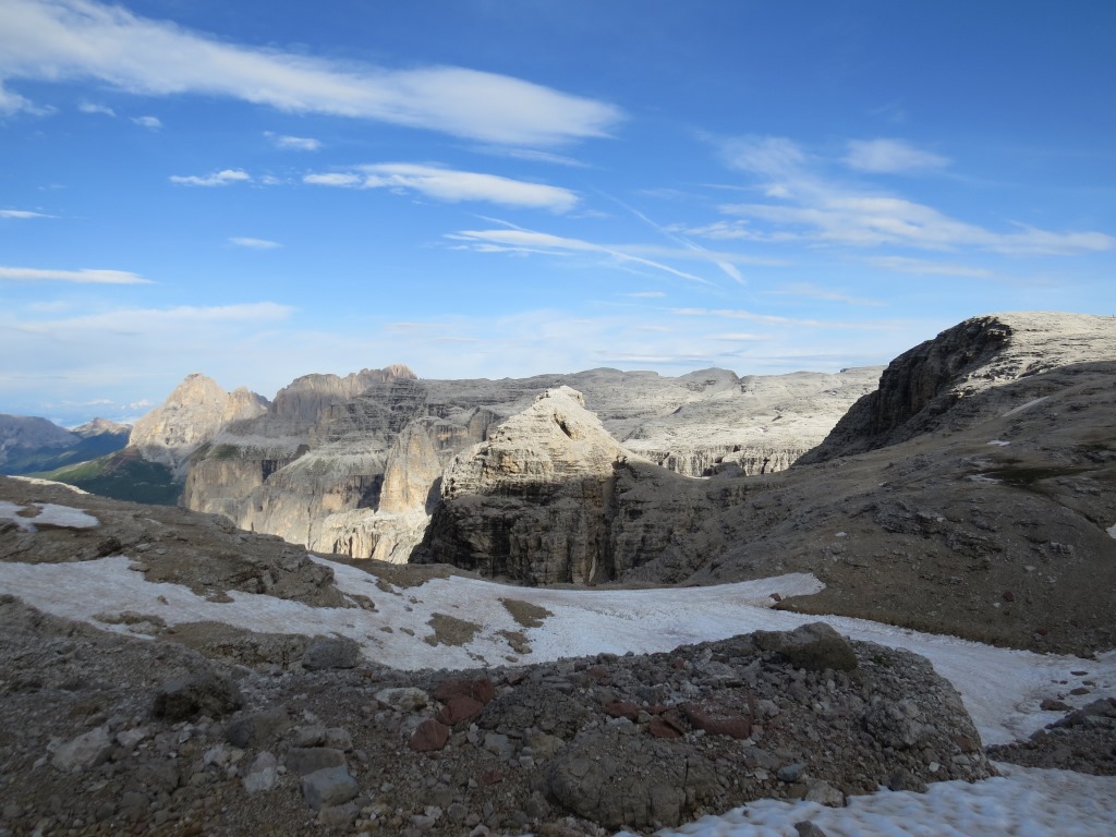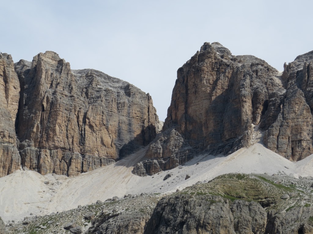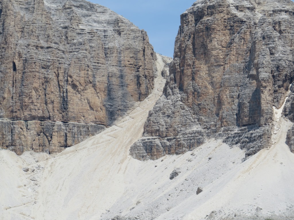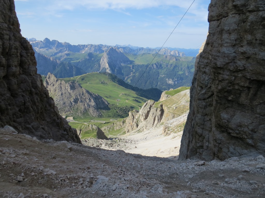 die Pordoi Scharte herangezoomt. Durch diese enge Passage haben wir die Sella Gruppe verlassen