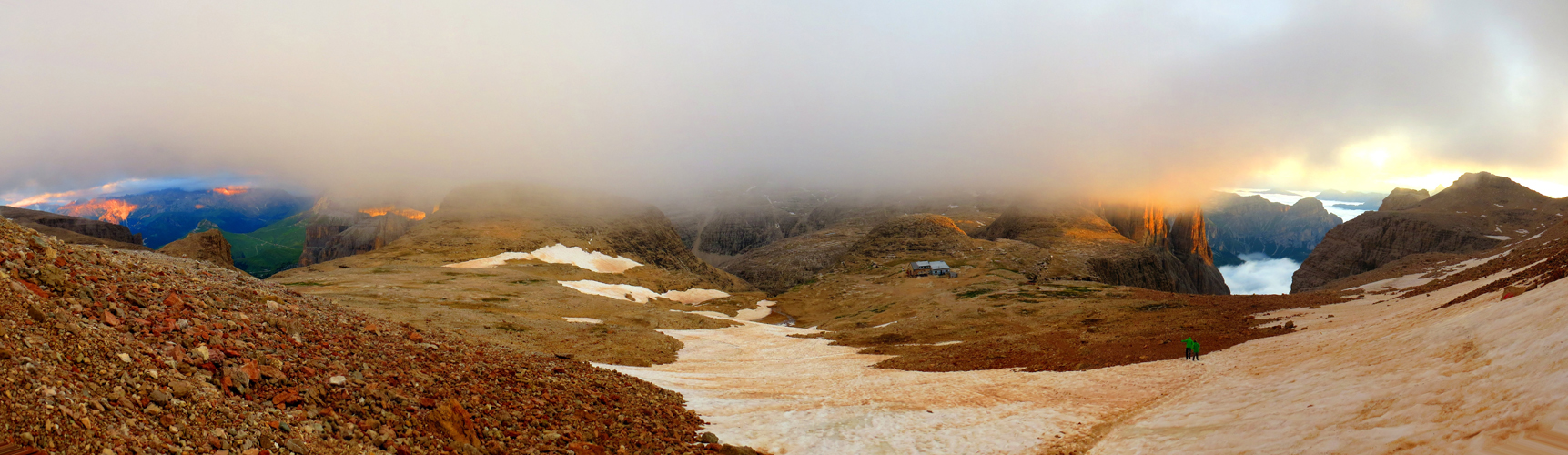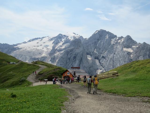Blick zurück zum Rifugio Boè. Gastfreundlichkeit findet man auf dieser Hütte leider nicht