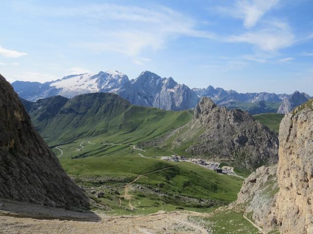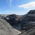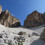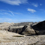 Blick hinauf zur Pordoi Scharte. Von dort oben sind wir gekommen