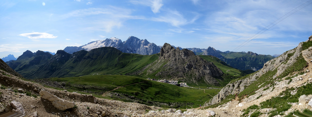 super schönes Breitbildfoto von der Pordoi Scharte aus gesehen