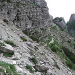 der Latschenbewuchs lässt den Weg weniger dramatisch erscheinen. Zum teil ist er Stahlseilversichert