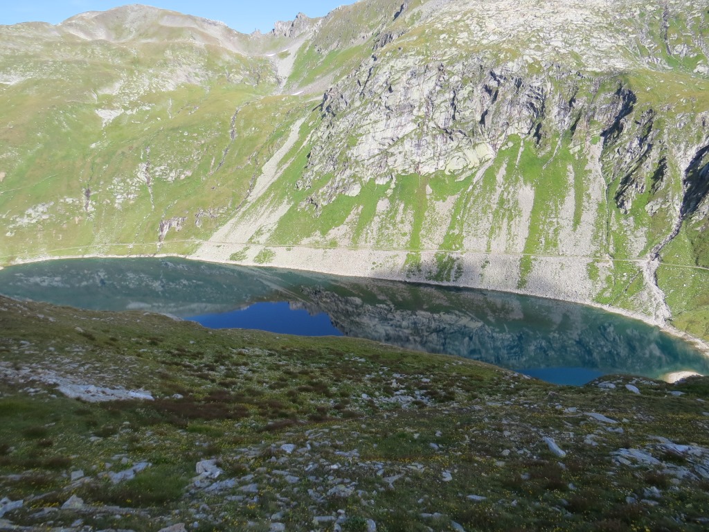 Blick auf den Lago della Sella. Gut ersichtlich der Weg den wir auf dem Rückweg machen werden