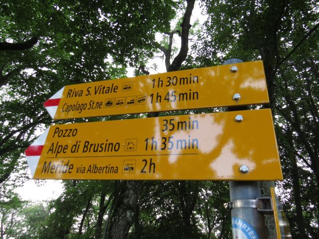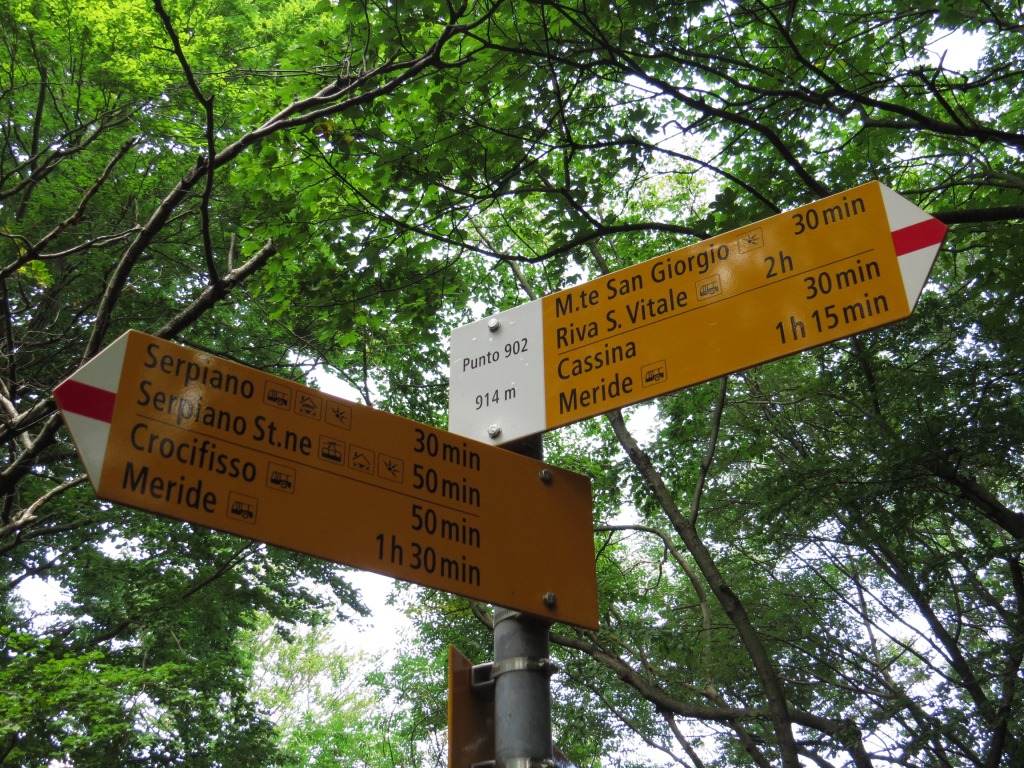 Wegweiser bei Punkt 914 m.ü.M. hier stossen wir auf den Wanderweg der von Serpiano her kommt Datum 13.03.2015