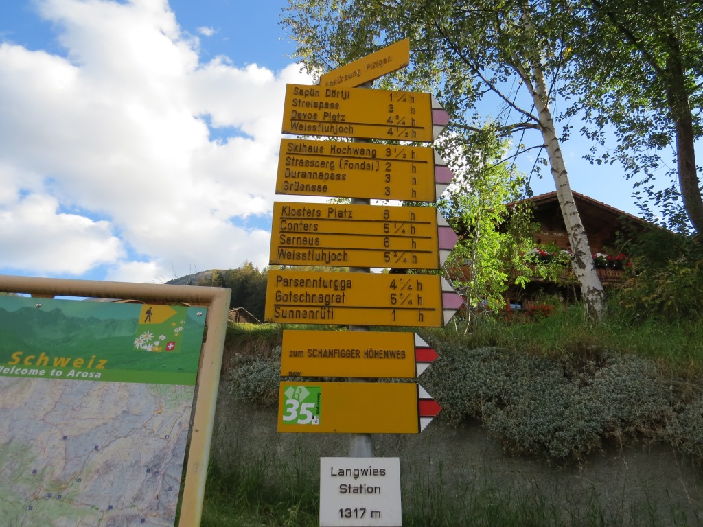Wegweiser beim Bahnhof Langwies 1317 m.ü.M.