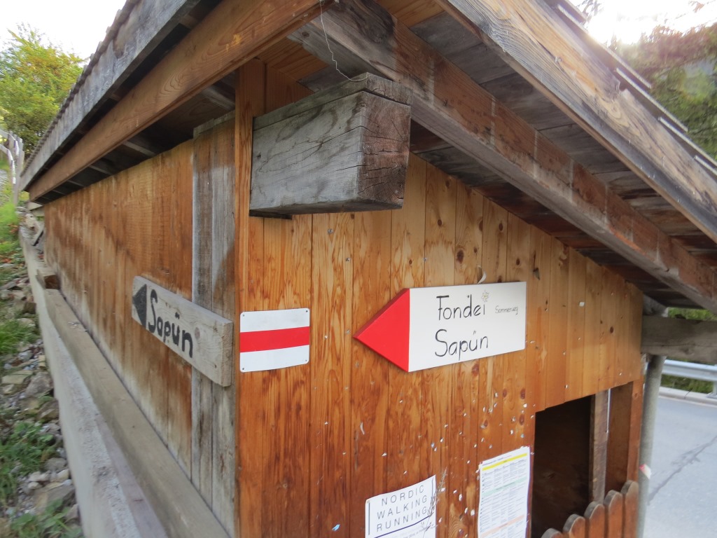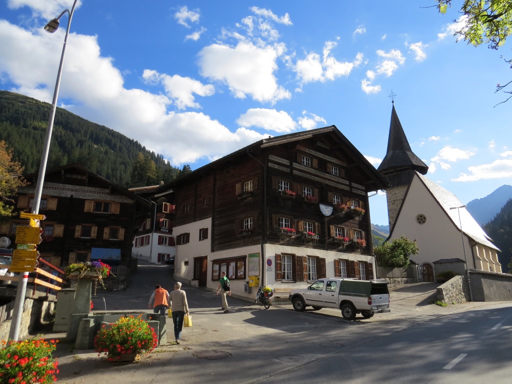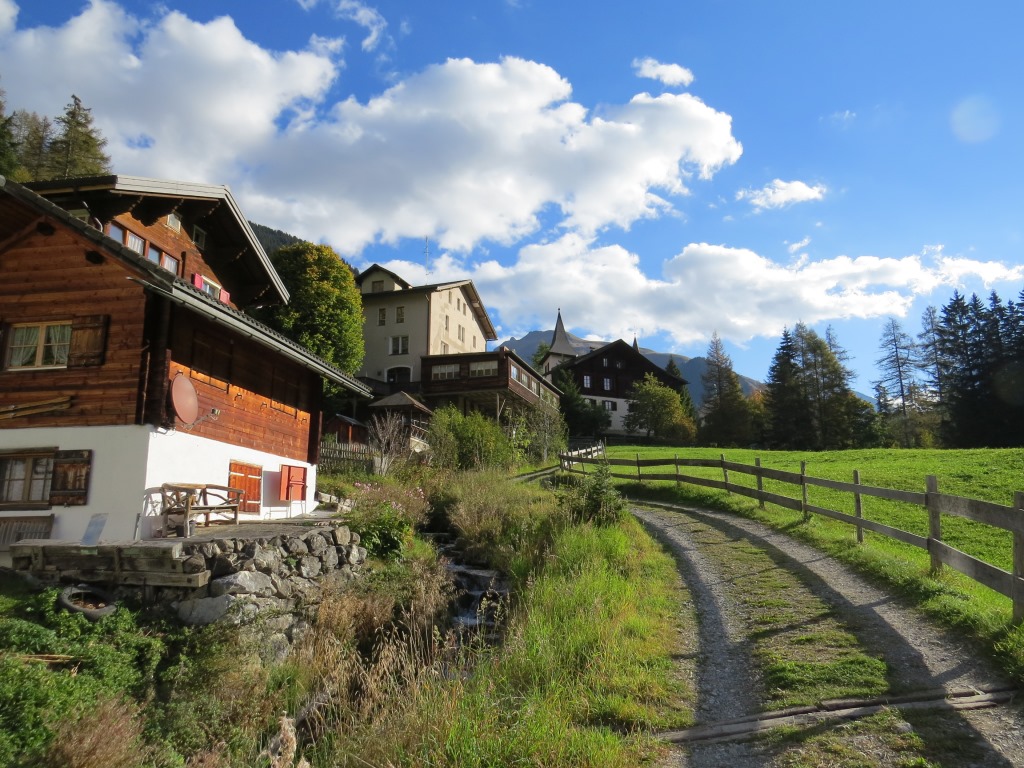 links an der Dorfkirche vorbei und oberhalb der Haupstrasse, geht es Richtung Sapüntal
