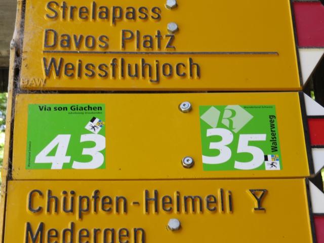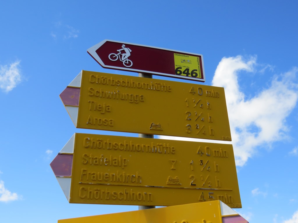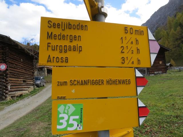 Wegweiser unterhalb der kleinen Alpsiedlung Tieja. Hier biegen wir rechts ab Richtung Arosa