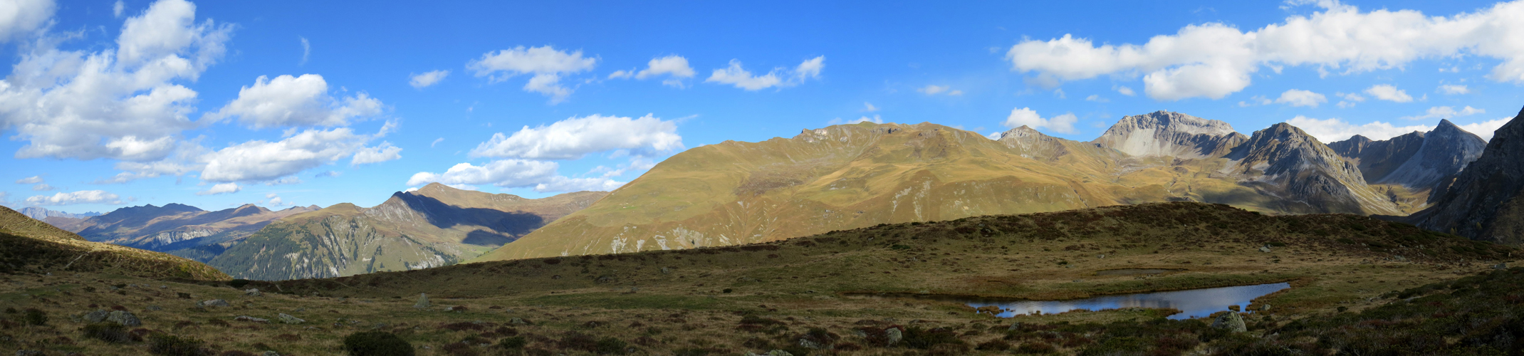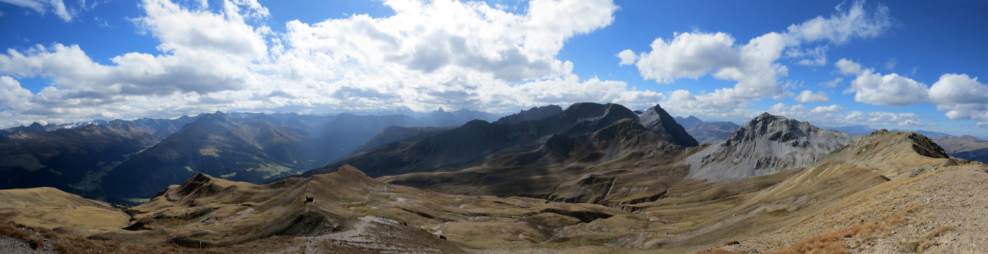 schönes Breitbildfoto mit Blick zum Mattjisch Horn links. Weissfluh, Haupter Horn, Haupter Tälli und Gross Schiahorn rechts