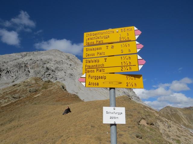 Wegweiser auf der Schwifurgga 2519 m.ü.M.