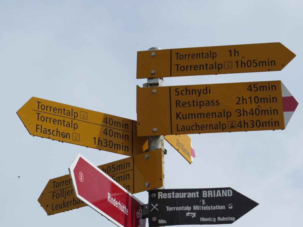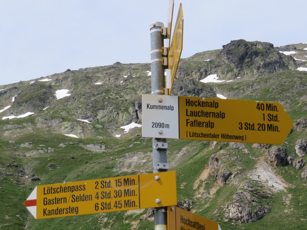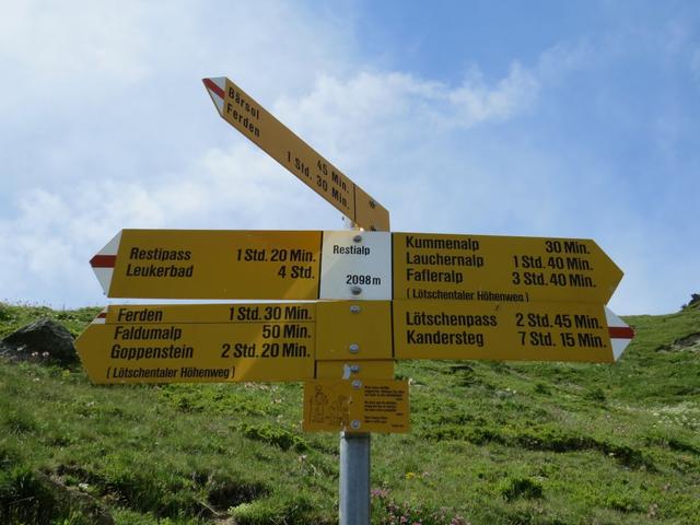 Wegweiser auf der Restialp 2098 m.ü.M. weiter geht es zur Kummenalp