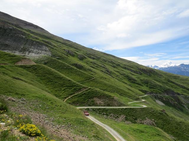 über eine Alpstrasse verlassen wir die Restialp. Tief unter uns rauschen die Züge durch den Lötschbergtunnel