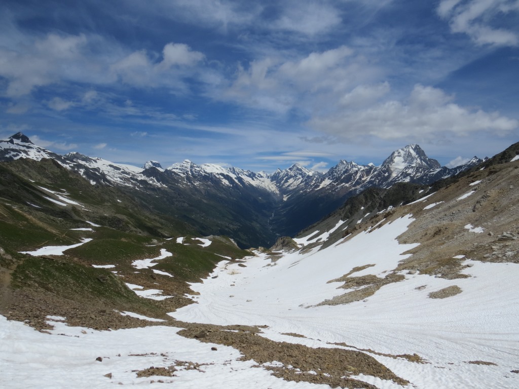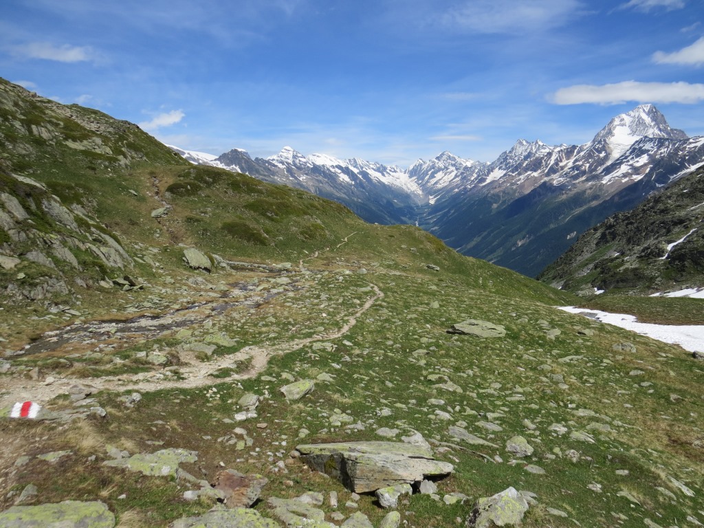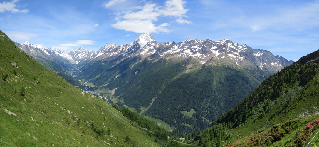 sehr schönes Breitbildfoto. Rechts der Niwenübergang, der Faldumpass und danach der Restipass