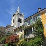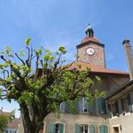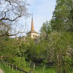 schon von weitem ist der grosse Kirchturm der Kirche von Cossonay ersichtlich