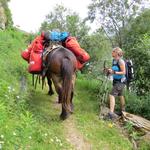 vor uns taucht eine Gruppe von Säumer auf, mit Packpferd