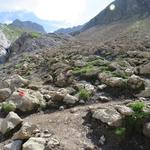 links und rechts vom Weg können wir Alpenblumen betrachten