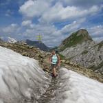 rechts am Altschneefeld vorbei, zieht der gut ersichtliche Bergpfad in die Höhe
