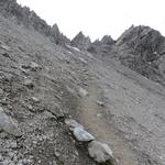 über feines Geröll verlassen wir die Umgebung der Scharte