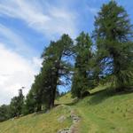 der Wanderweg führt uns nun aufwärts durch einen Lärchenwald. Die ersten grossen Lärchen sind erkennbar Datum 14.01.2017