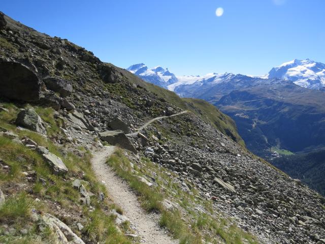 anfangs direkt auf dem Kamm der mächtigen Seitenmoräne, geht es talauswärts