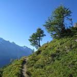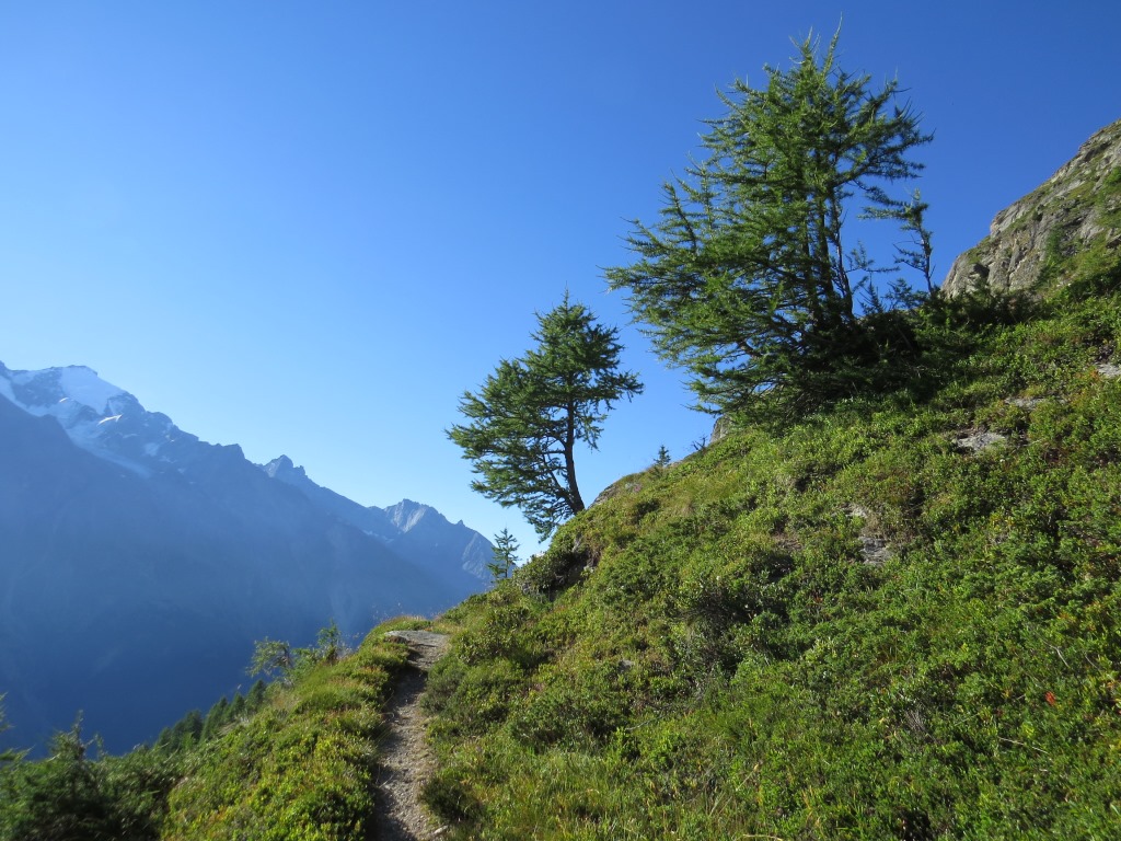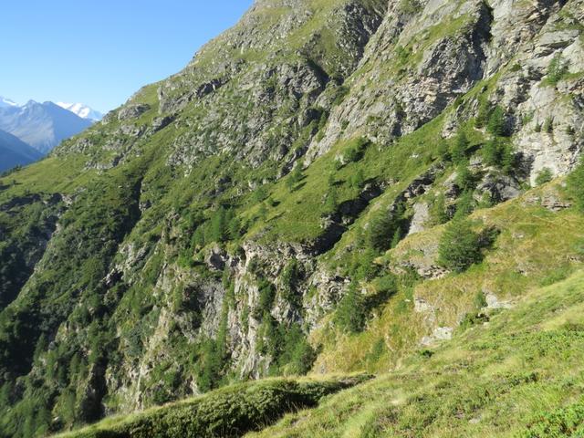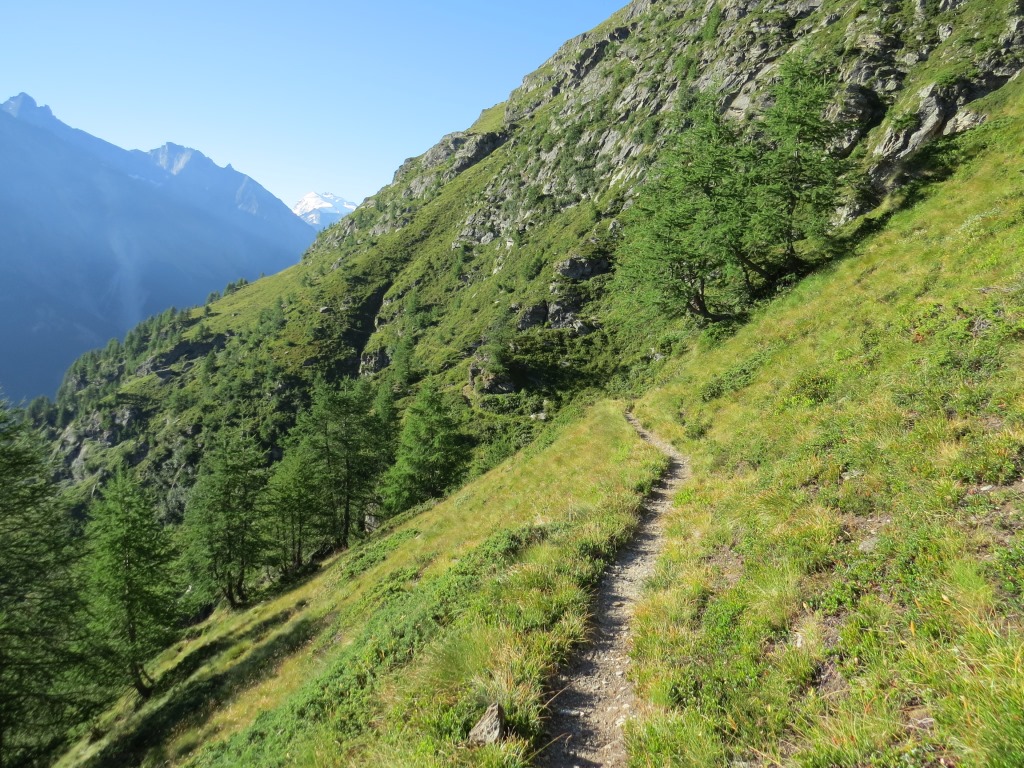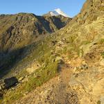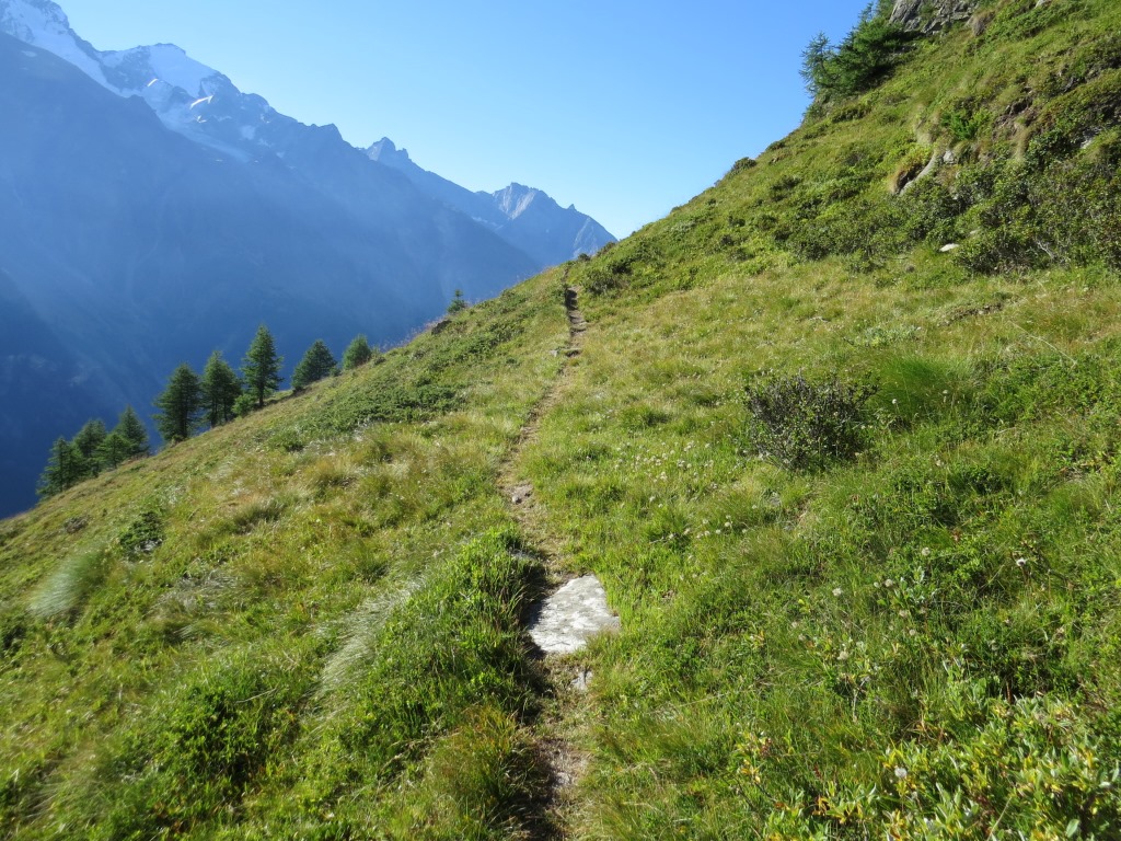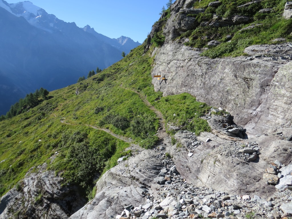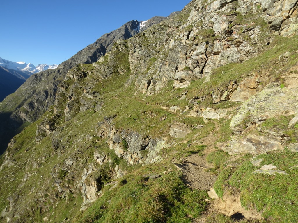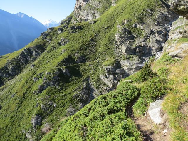 geschickt schmiegt sich der niemals grosszügige, teilweise ausgesetzte, aber immer passable Pfad an der Bergflanke
