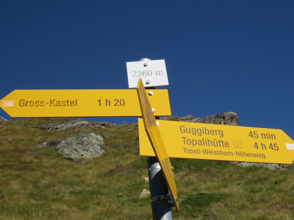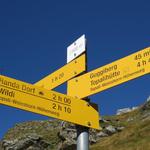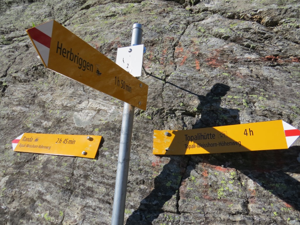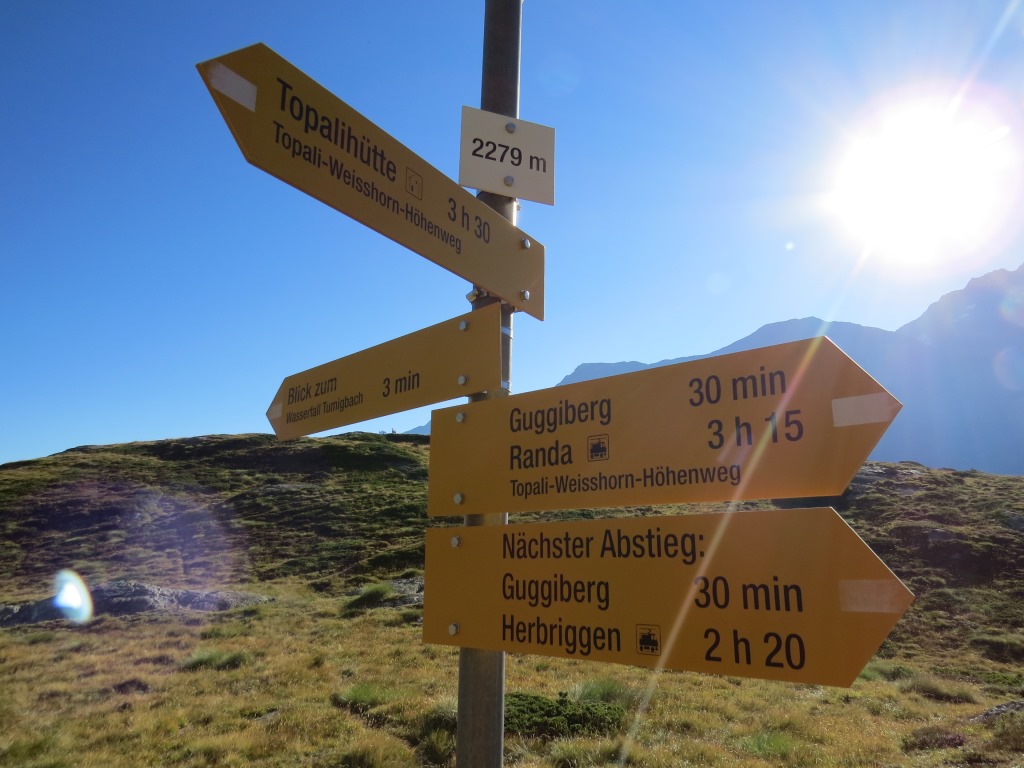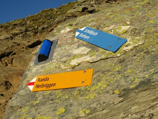 Wegweiser bei der Weggabelung 2232 m.ü.M. Hier besteht die Möglichkeit ins Mattertal runter zu laufen