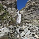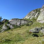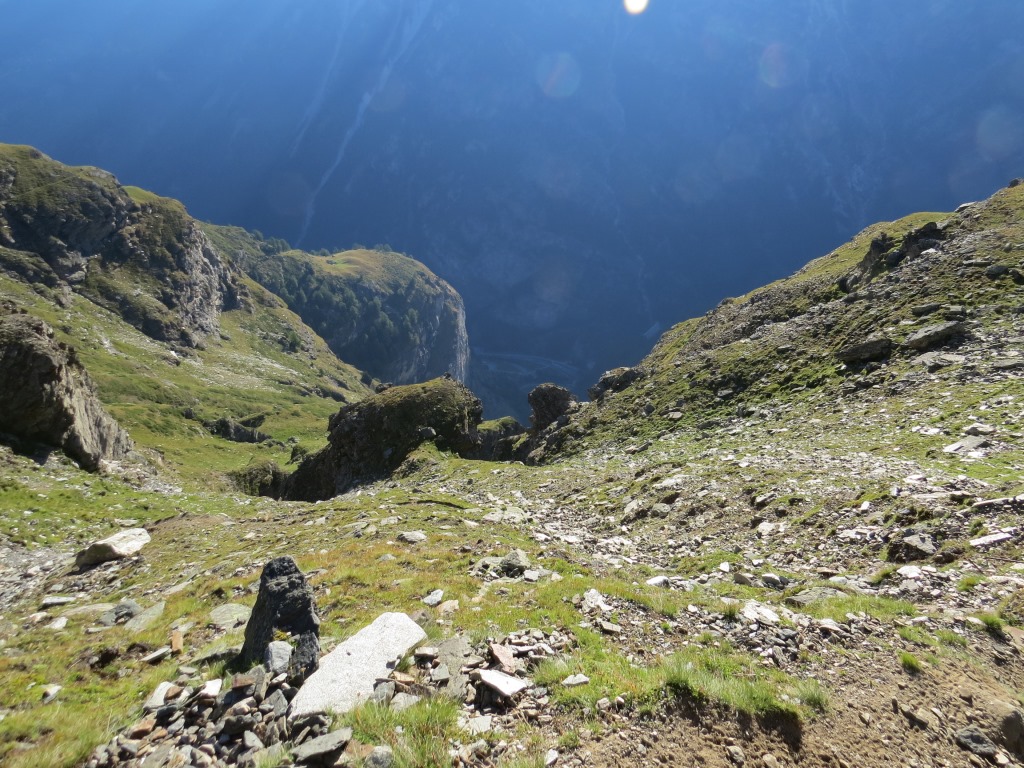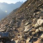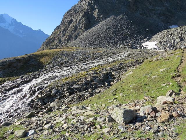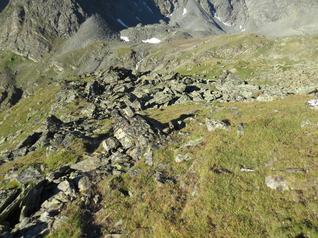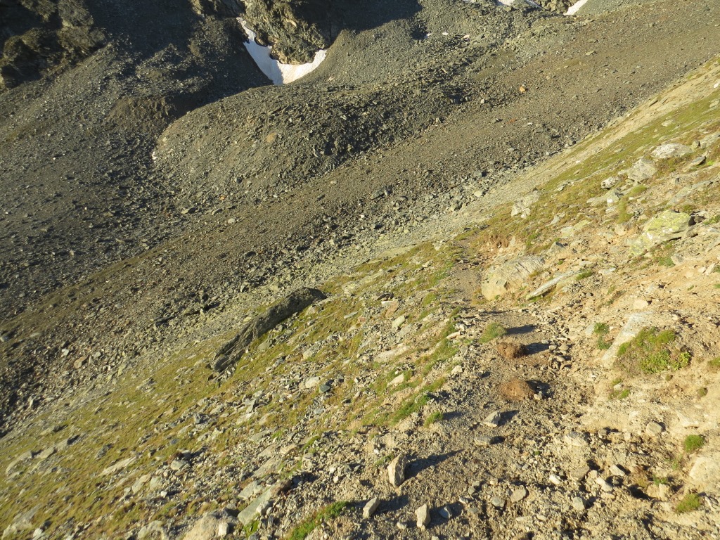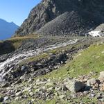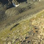 der Weg führt nun vom Rand dieser kleinen Fläche, steil hinunter in das gewaltige Schuttkar des Tälli unter dem Abberggletsch