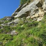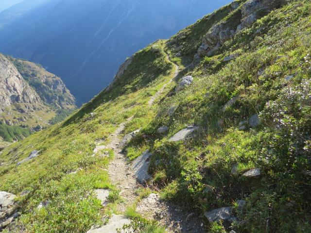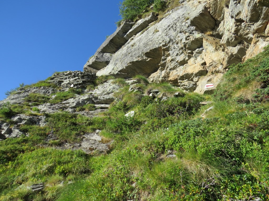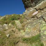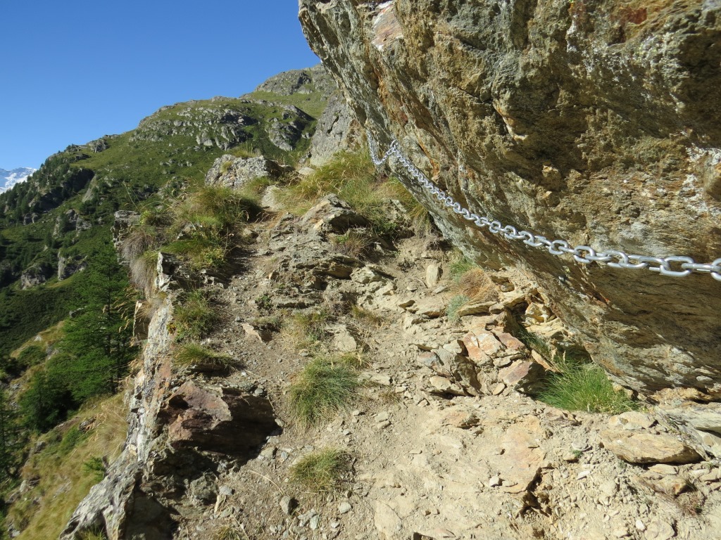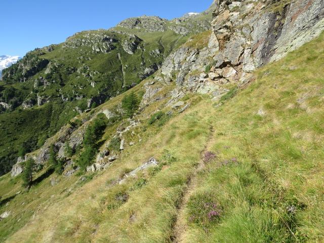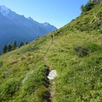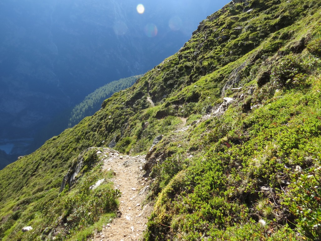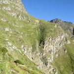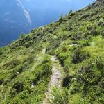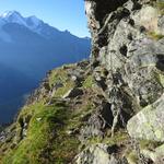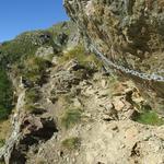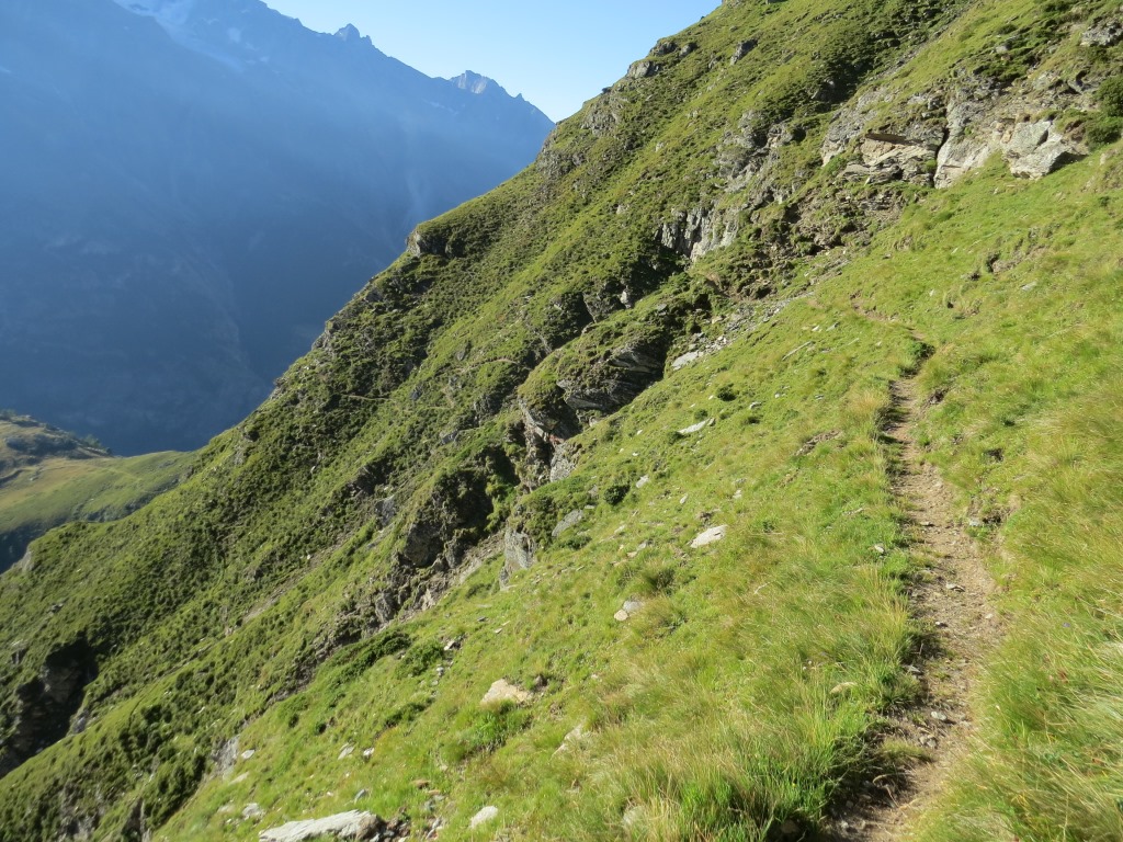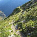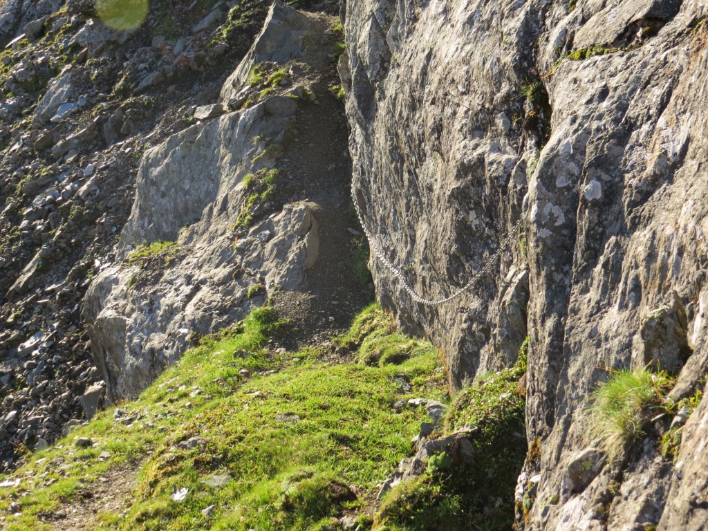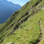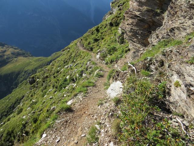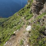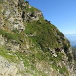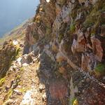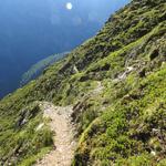 schmale und ausgesetzte Wegabschnitte, teilweise durch steile begraste Flanken müssen nun durchschritten werden
