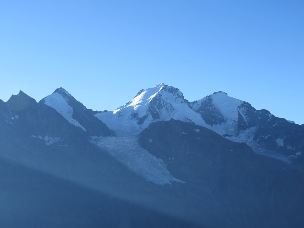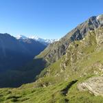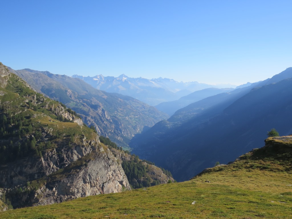 Blick über das Mattertal hinaus in das Rhonetal. Am Horizont zeigt sich schön das Bietschhorn