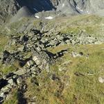 der Weg führt nun vom Rand dieser kleinen Fläche, steil hinunter in das gewaltige Schuttkar des Tälli unter dem Abberggletsch