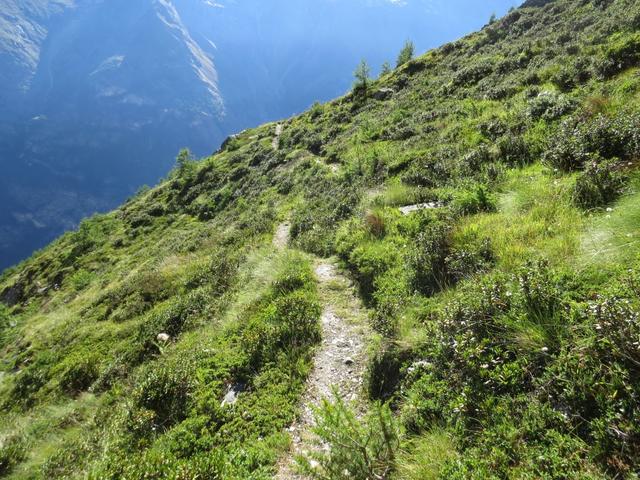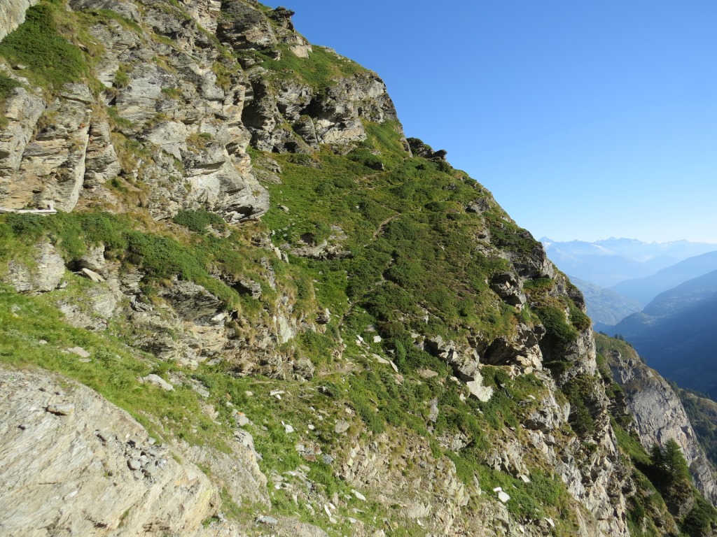 geschickt schmiegt sich der niemals grosszügige, teilweise ausgesetzte, aber immer passable Pfad an der Bergflanke