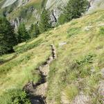 schmale und ausgesetzte Wegabschnitte, teilweise durch steile begraste Flanken müssen nun durchschritten werden