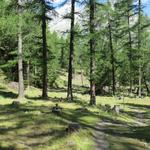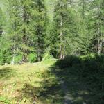 wir biegen rechts ab und verlieren weiterhin durch einen Lärchenwald laufend, über diverse Windungen an Höhe