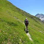 der einfache Wanderweg windet sich nun über grüne Weiden...
