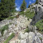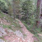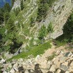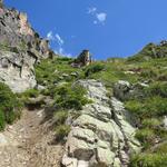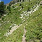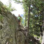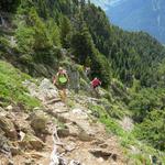der Bergpfad verlangt nun bei 2-3 Stellen sogar etwas Handanlegen. Steil schiessen die Bergflanken in die Tiefe