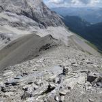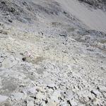 über Blockschutt geht es ein bisschen mühsam, eher steil und rutschig abwärts