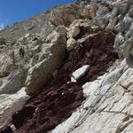 hier müsste man Geologe sein. Der vorherrschende hellbraune Felsen wird durch rostrote Einschüsse unterbrochen
