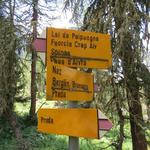 Wegweiser auf der Alp Zavretta 2271 m.ü.M. unser nächstes Ziel lautet nun Fuorcla Zavretta