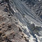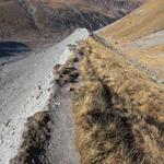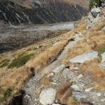 die Seitenmoräne besteht hauptsächlich aus bröseligem Gestein und Sand, Rutschgefahr! Datum 26.03.2018